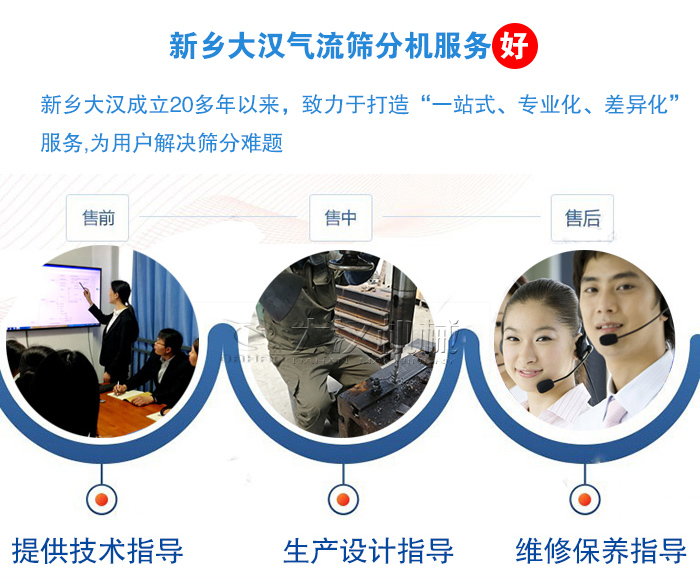 新鄉(xiāng)大漢成立20多年以來,致力于打造“一站式、專業(yè)化、差異化”服務,免費對用戶進行選型指導和安裝、調試及后期維修服務,不斷加強改善用戶的體驗,用戶購買我們的設備之后,我們會定期進行回訪調查,真實了解到每一位用戶的使用情況,以全面、細致的服務解決用戶所遇到的篩分難題。