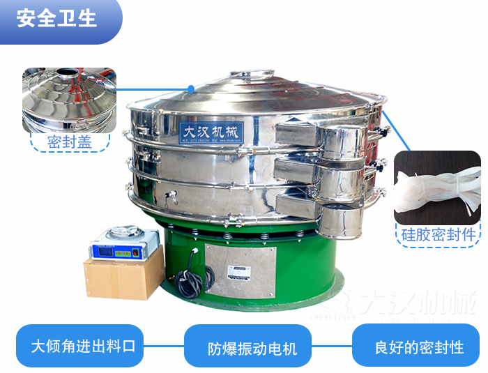 為了保證原材料的衛(wèi)生情況,維生素粉超聲波振動篩要具有良好的密封性,密封件全部采用食品硅膠,網(wǎng)架采用潔凈型粘接網(wǎng)架。減震彈簧部分由不銹鋼圍裙包裹;振動電機(jī)可定制為更為安全的防爆振動電機(jī),確保生產(chǎn)安全。考慮到消毒清洗的性和簡便性,超聲波振動篩的出料口、進(jìn)料口設(shè)計需要采用大傾角設(shè)計,更利于清洗和消毒。