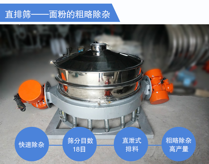 在面粉的制備過程中,面粉中會混有不小心落入的合格證、包裝線頭等大顆粒雜質,通常雜質的含量在5%左右,為了快速除去這些雜質,通常選用直排篩作為面粉篩,此時一般的篩分目數要求是18目。