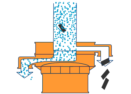 由直立式振動電機作為激振源,電機上、下兩端安裝有偏心重錘,將電機的旋轉運動轉變?yōu)樗健⒋怪薄A斜的三次元運動,再把這個運動傳遞給篩面進行篩分。調(diào)節(jié)上、下兩端的相位角,可以改變物料在篩面上的運動軌跡。